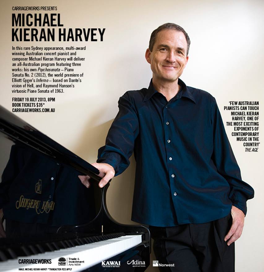 We thought you might be interested to hear that multi-award winning Australian concert pianist and composer Michael Kieran Harvey will be performing at Carriageworks this July. In this rare Sydney appearance, Harvey will deliver an all-Australian program featuring three works: his own Psychosonata – Piano Sonata No. 2 (2012), the world premiere of Elliott Gyger’s Inferno based on Dante’s vision of Hell, and Raymond Hanson’s virtuosic Piano Sonata of 1963. Renowned for his eclectic and extensive repertoire that embraces both traditional masterworks and experimental areas, Michael Kieran Harvey’s work has featured in several Australian and international festivals.
