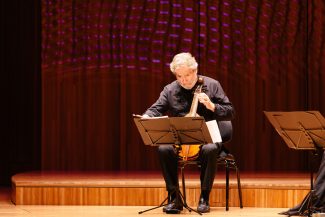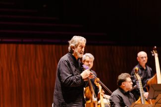 Savall led his ensemble from the treble viol with meticulous grace and discretion. Comprising Philippe Pierlot playing treble and bass viols, Lixsania Fernandez playing tenor viol, Juan Manuel Quintana and Lorenz Duftschmid on bass viols, Xavier Puertas on violone, Enrike Solinis on theorbo and guitar and David Mayoral on percussion, the ensemble wove its way through songs, dances and other charming pieces spanning two centuries from the early 1500s. There was melody and polyphony, Orientalist fantasias and complex counterpoint in the music by a range of composers from Western Europe who included Parsons, Dowland, Ferrabosco, Charpentier, Purcell and Bach.