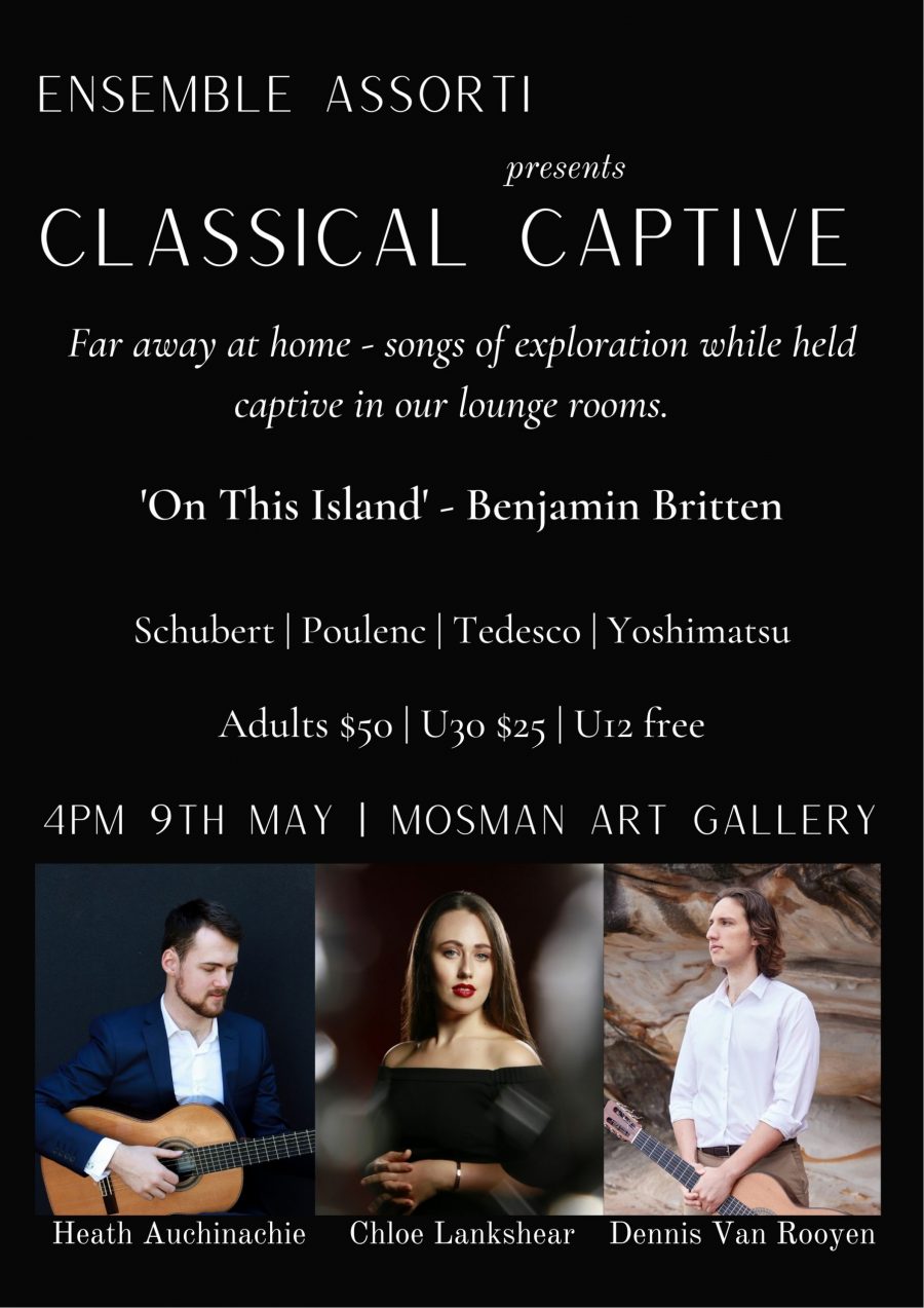 Ensemble Assorti presents its debut concert Classical Captive – an art song degustation menu set during the trio’s months of lounge room lockdown in 2020. The trio features soprano Chloe Lankshear, and guitarists Heathcliffe Auchinachie and Dennis Van Rooyen. The program includes brand new arrangements by the trio of well-loved pieces by Schubert and Poulenc, as well as Benjamin Britten’s song cycle On This Island and guitar duets by Kunda, Tedesco, and Yoshimatsu.