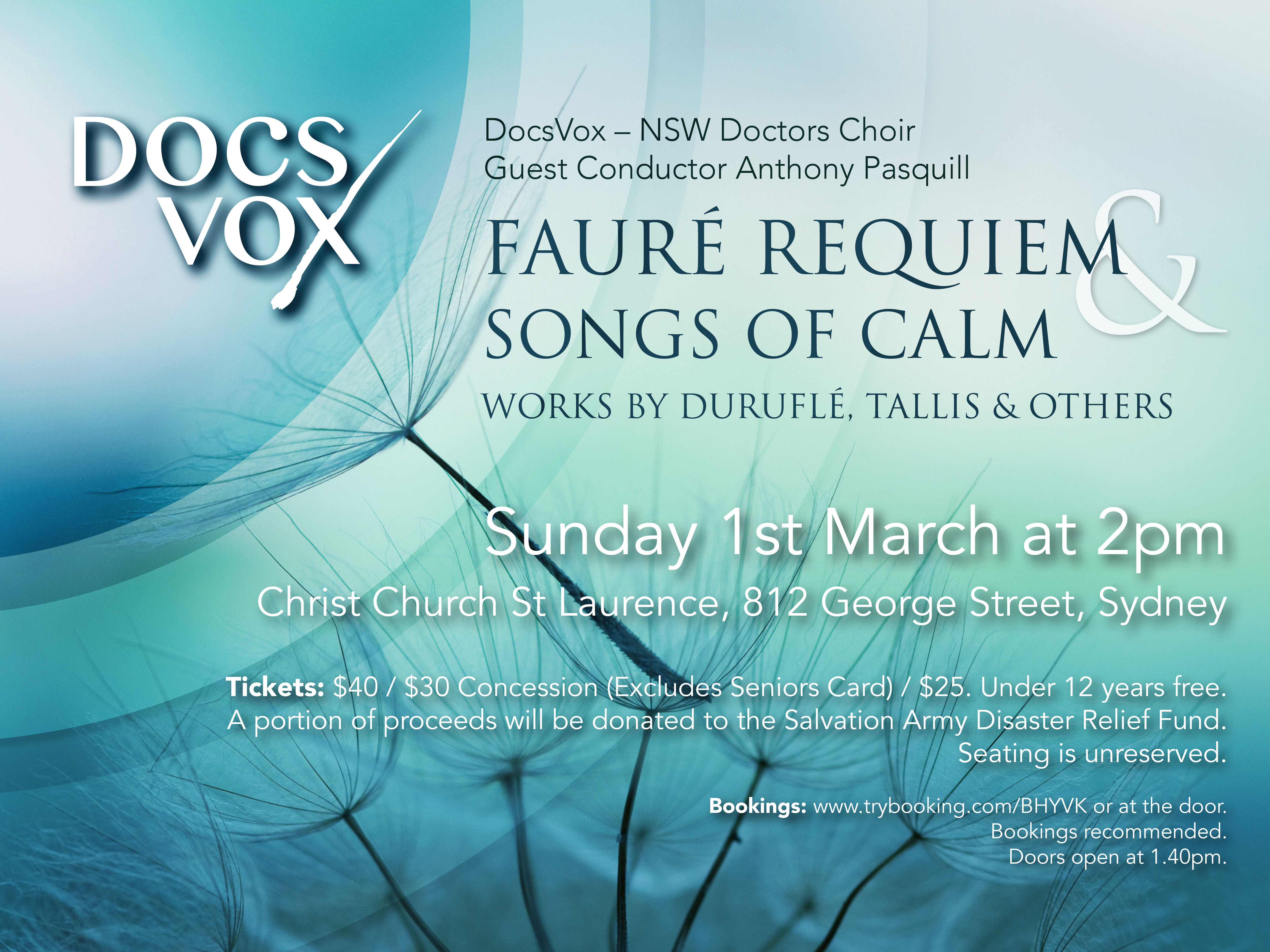 DocsVox – NSW Doctors Choir, with guest conductor Anthony Pasquill and soloists Dr Wei Jiang and Dr Sam Elmi, highlight the healing power of music with Fauré Requiem and Songs of Calm – an afternoon of tranquil music in the midst of a turbulent world. Also in the programme, works by Tallis, Duruflé, Pärt and others.