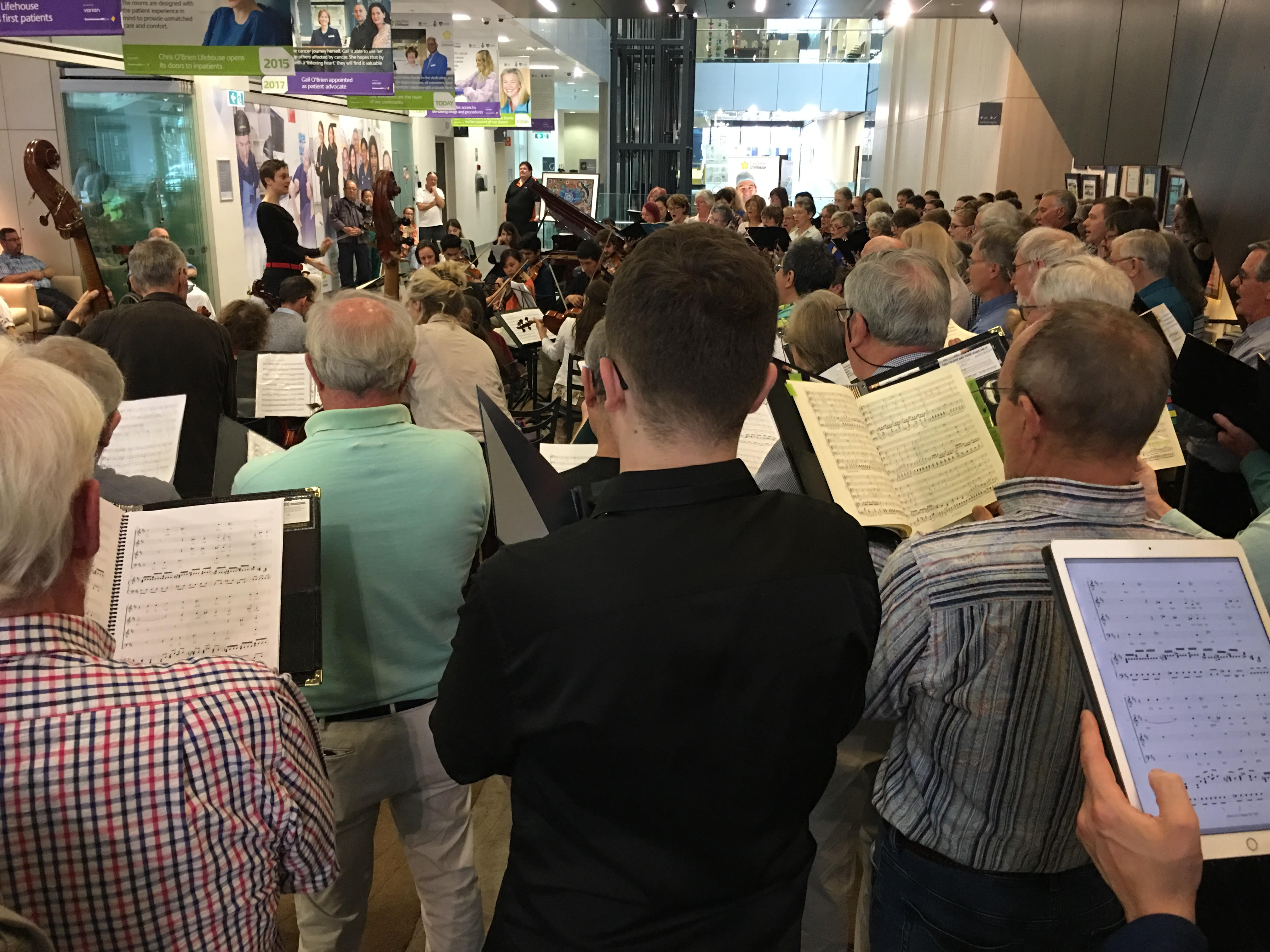 One spring Sunday afternoon in Sydney, just a few weeks ago, a motley conglomerate of around 100 choral singers and instrumentalists gathered with two solo singers, under the music direction of Dr Sarah Penicka-Smith, to perform in a hospital foyer. These people had never previously performed together as group. However, such was the spirit and the passion of those who volunteered their time and talent for this venture, that after a brief run through of ‘tops and tails’ (where one movement in the piece joins the next), the participants delivered a truly dazzling sound which wafted up through the heights of the foyer to reach the wards and corridors of the building.