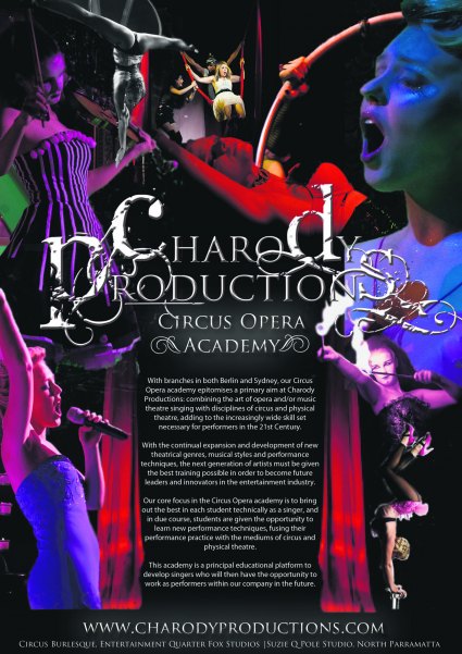 The academy represents the aim at Charody Productions of combining the art of opera and classical music performance with disciplines of circus and physical theatre, adding to the increasingly wide skill set demanded of performers in the 21st Century. This combination of styles has certainly pleased audiences of her productions.